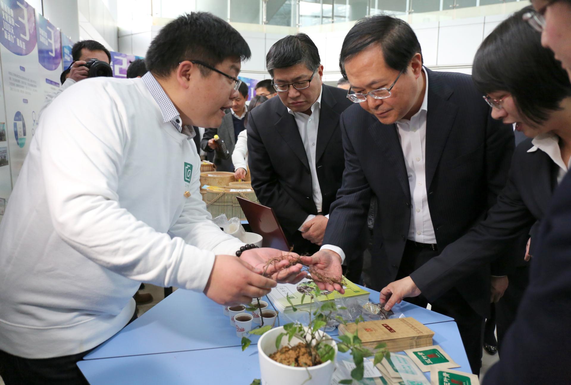 在学校众创空间,10多个校友、教师、学生创业团队向来宾展示了各自的创新创业成果。车俊省长详细询问了各个项目的进展情况,并与他们深入交流创新创业方面的想法、做法以及遇到的困难和问题,鼓励他们放开手脚创新创业,并不断总结经验教训,提取积累更多的成功因子。当得知何叶丹、刘琦鑫校友伉俪毕业返乡扎根农村,投身农村金融创新后,车俊省长鼓励他们说“创业路上的革命伴侣可以传为一段佳话,你们能发挥所学专长,把农村金融创新和现代农业生产相结合,很值得鼓励学习,好好做下去,一定能取得成功!”