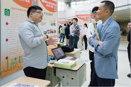 作品展中的部分项目引起了校友与老师的极大兴趣与热议。例如,在“show you”项目中,大四学生李宏彬提出了符合大学生需求的广告推广模式。他说:“我希望通过简洁的方式提取个人的闪光点,更好地实现人才与企业、企业与市场的对接”。针对“杭州三叶青农业科技有限公司”项目,有在场校友客观地提及了种植的可能性和推广的实际性问题,引发了一系列讨论,帮助项目负责人更深入地评估和完善项目。“歌颂视觉影像”负责人大四学生胡丹妮说:“刚才有一位校友跟我谈到了互联网时代的特殊性与便捷性,让我一下子对自己的项目有了更加全面的认识和新的设想。”针对此次作品展,浙江兆久成智能系统有限公司董事长张将勇校友表示:“我觉得展出的作品都十分优秀,都有各自的可取之处。”但同时,他也为在场的创业大学生提出了中肯的意见:“我要说的是,企业投资重视的是实用性,你不能只停留在理论,而要实际去运用。”他认为单纯的模仿和过度的超前都是不可取的,应当要有自己的想法,同时也要注重实际,众多校友与老师对此表示赞同。