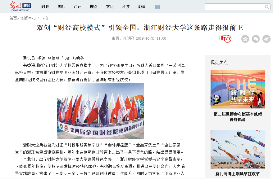 10月30日,《光明网》《杭州日报》、《杭州网》《网易》、《今日头条》、《凤凰新闻》等媒体以《双创“财经高校模式”引领全国,草莓视频 这条路走得很前卫》为题,大篇幅报道了学校不断发挥财经特色优势,有效融合校友资源,推进政产学研合作,大力倡导实践教育,构建“三高、三全、三特”创新创业教育工作体系。