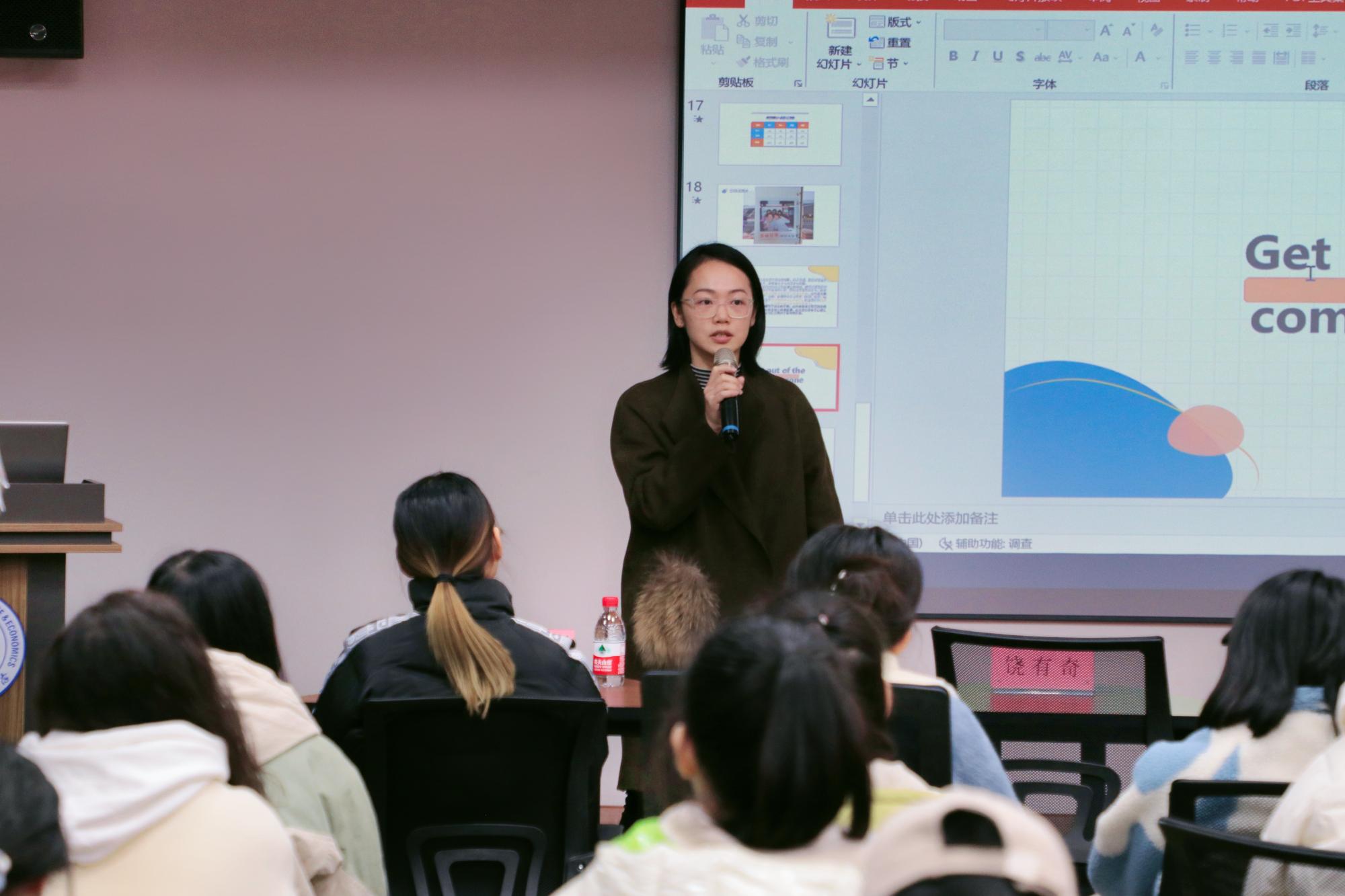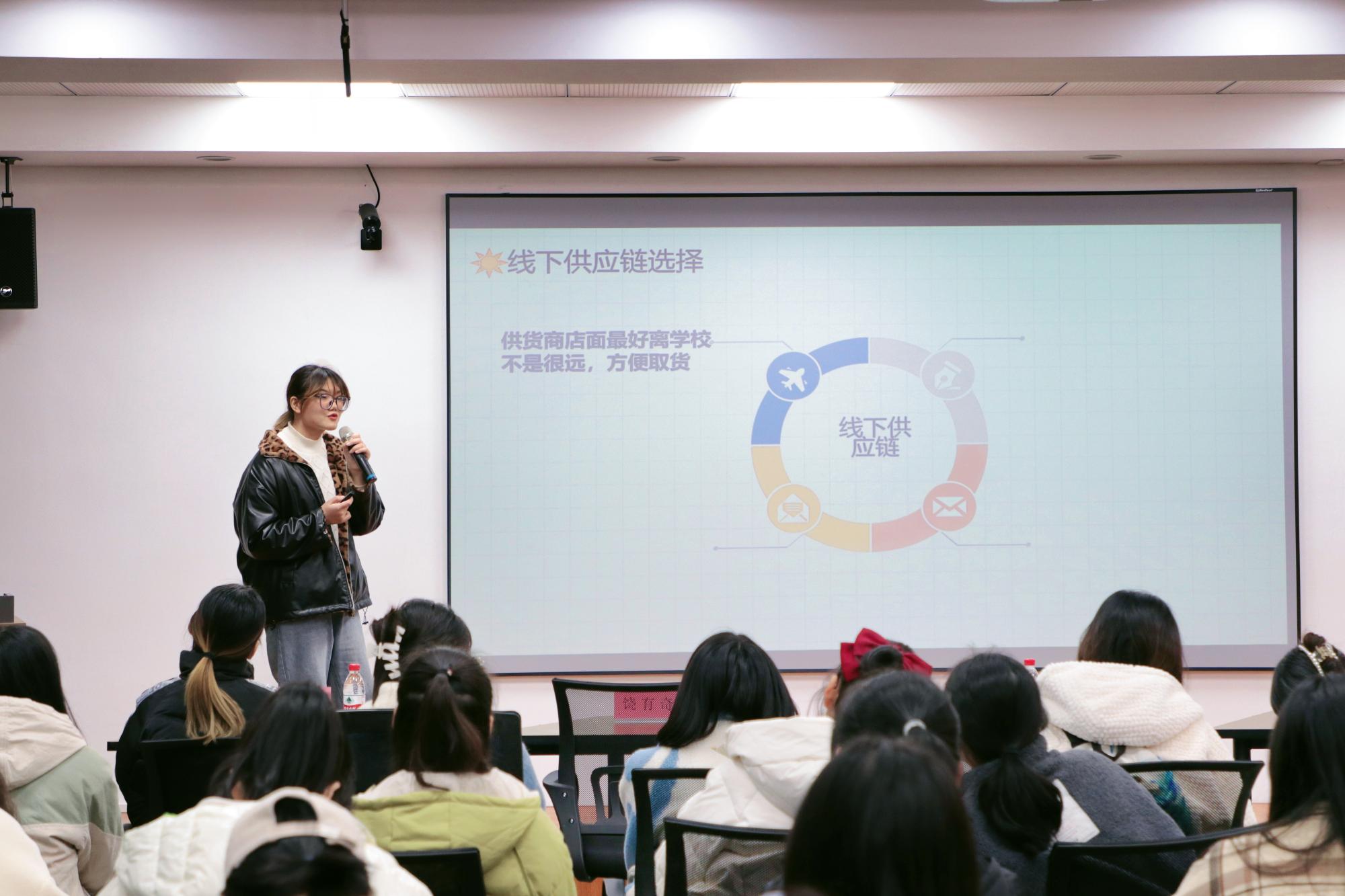 20经济统计1班的孙思宇同学以自身为案例,结合参与蓝创市集等创新创业实践活动的经验,从团队选择、产品选择、线下及线上供应链选择和营销与推广四个方面,为同学们详细讲解了自身的创业技巧及经验。