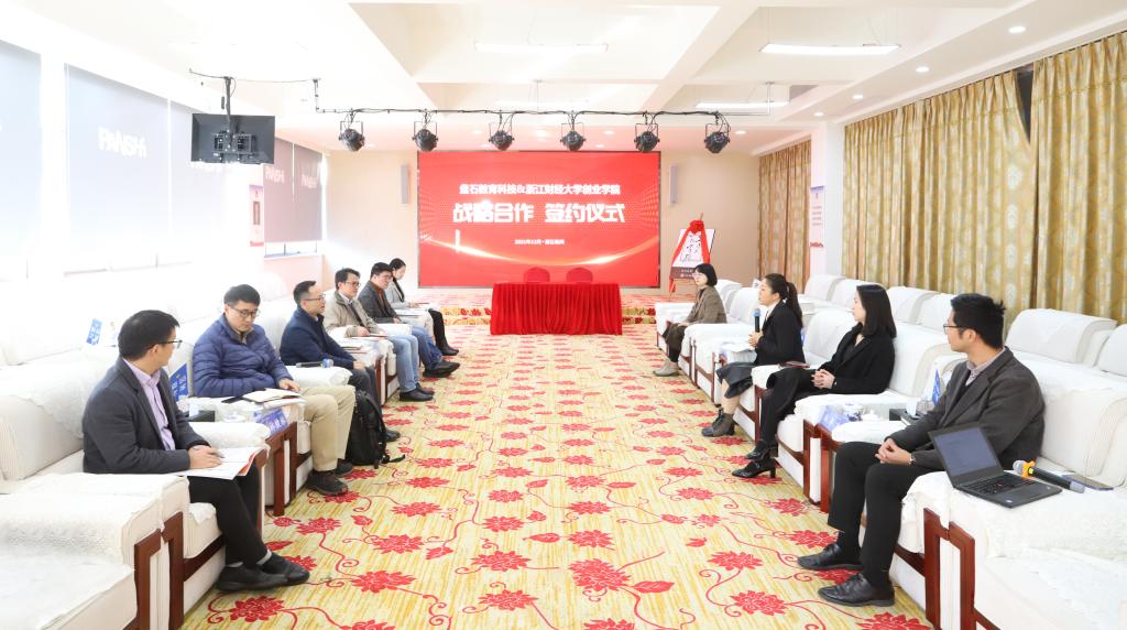 童夏雨介绍了学校双创教育基本情况,他指出此次学院与盘石教育科技合作,是实现产教融合的重要一步,能够让学生更加深入了解数字经济,把学生培养成优秀的数字经济领域人才。代晴晴介绍了磐石集团发展情况,她表示盘石集团将围绕数字经济职业人才的培养与学校展开合作,依托高校优质师资力量和生源,为数字经济产业发展输送人才。