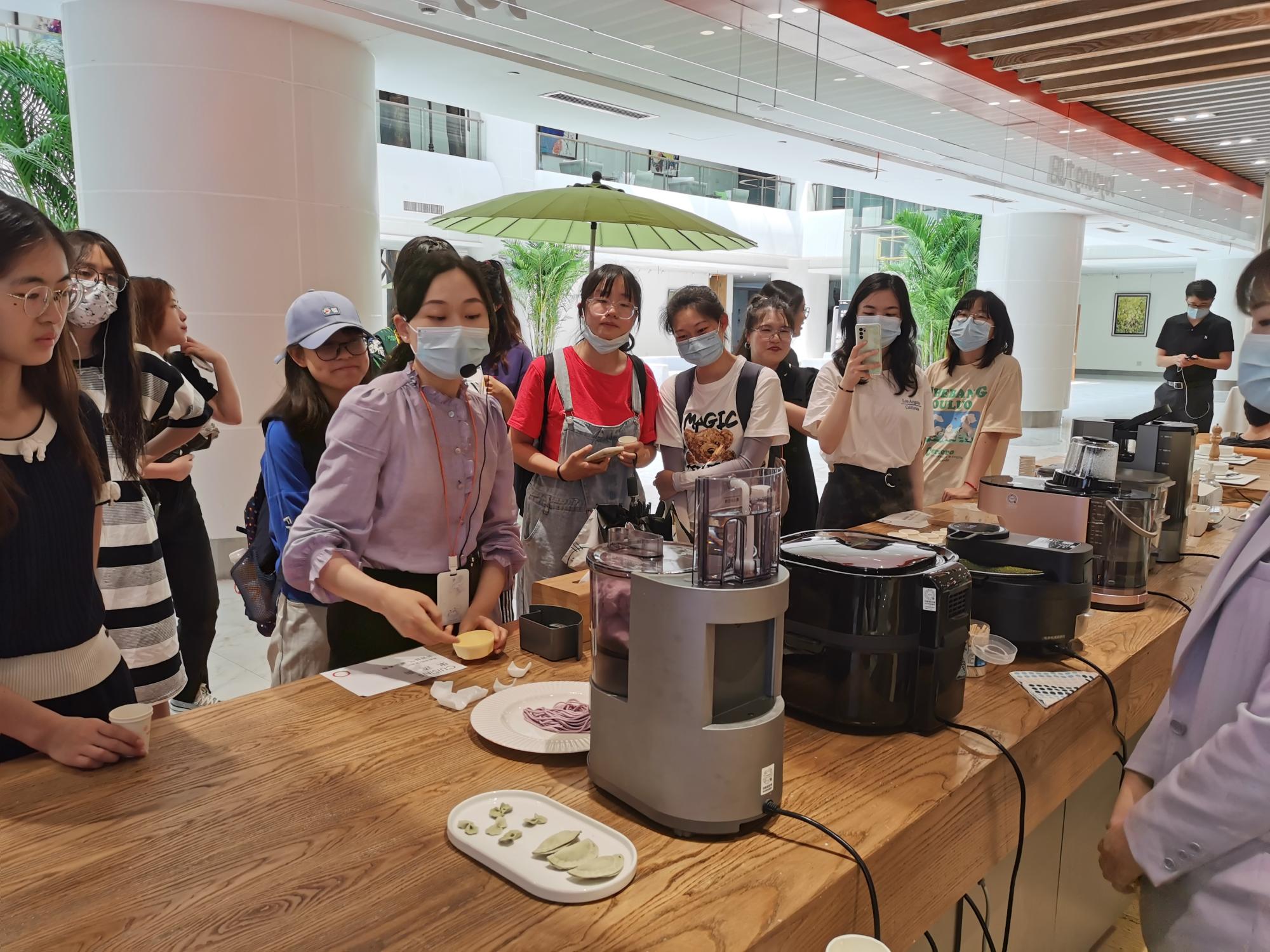 在接待专员的带领下,同学们走进九阳这个充满创造力的企业,了解其历史发展,经典产品,前沿科技。同学们跟随工作人员实地参观了九阳的无人化运行工厂,了解了豆浆机的制作过程及发展史。走进品牌体验馆,充满太空元素的产品展厅便跃入眼帘,一款款太空科技新品陈列其中,不禁让参观的访客们驻足挑选。在这里,同学们见证一颗颗普通的黄豆如何变成香醇的豆浆、在“太空厨房”为自己制作了一顿炸鸡翅、在AR虚拟人物互动装置下感受烹饪乐趣。