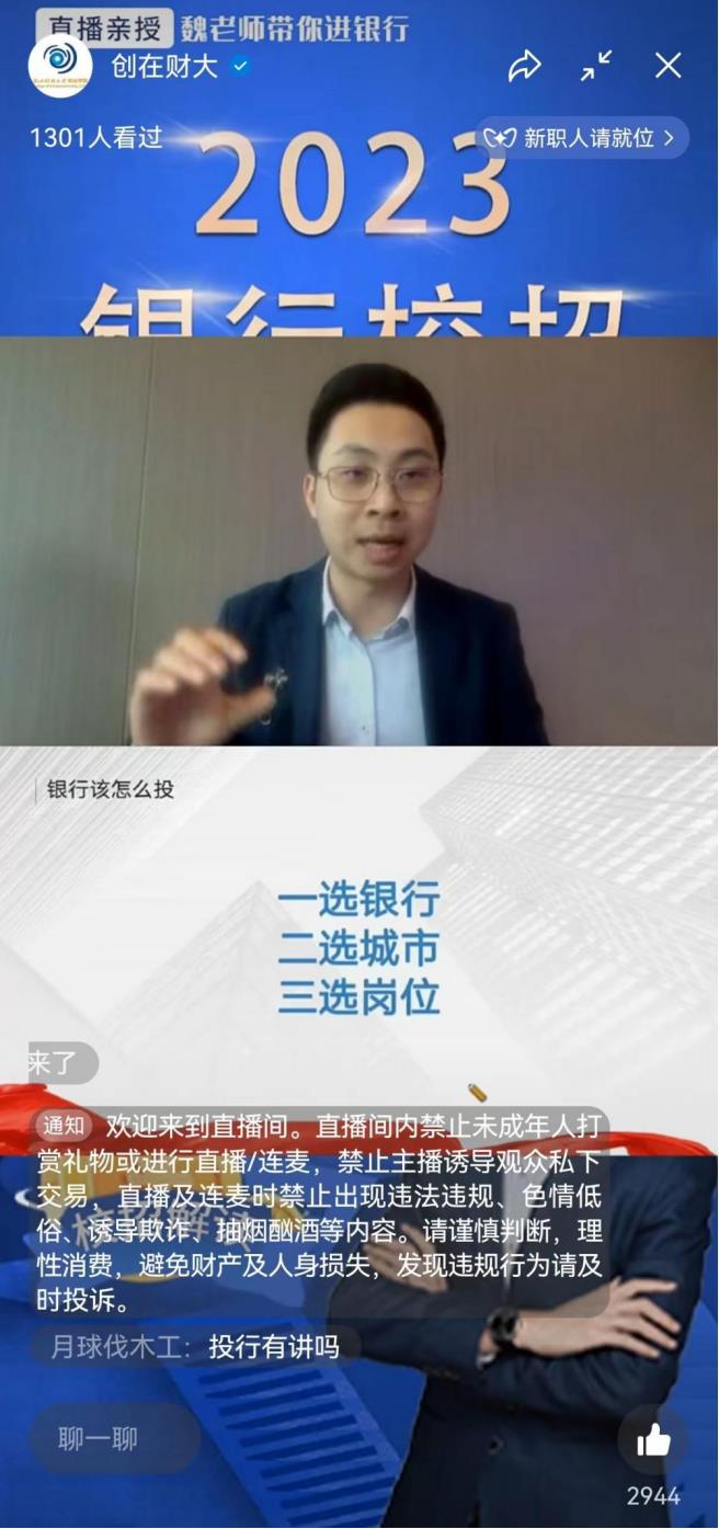 举办,绘梦蓝创空间承办的2023银行校招通关解读讲座在创在财大视频号顺利举行。为了大四应届生能够更好地应聘,激发低年级同学提前规划就业创业的积极性,学校特邀互联网加国赛评委专家、职派咨询董事长魏铼开展线上讲座,由职派咨询郭艳老师主持,共一千三百多名学生在线参与活动。