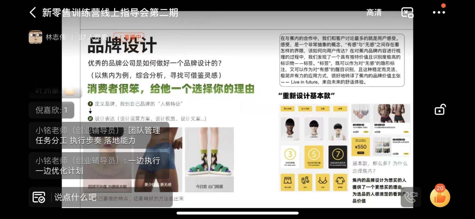 接下来,林志伟向同学们传授对于店铺活动运营的经验,并将其总结为快节奏、简单与复盘两大要点。同时,林指导建议同学们在活动运营方面应当抓住热点,例如双11、情人节等节日。以蕉内品牌为例,林志伟分析了一个优秀的公司应当如何做好品牌设计。他提出,品牌设计的初衷是给消费者一个选择该品牌的原因,为此品牌应先明确自己的品牌定义,之后再进行包括设计运营方案、设计视觉、设计文案等一系列的设计表达。