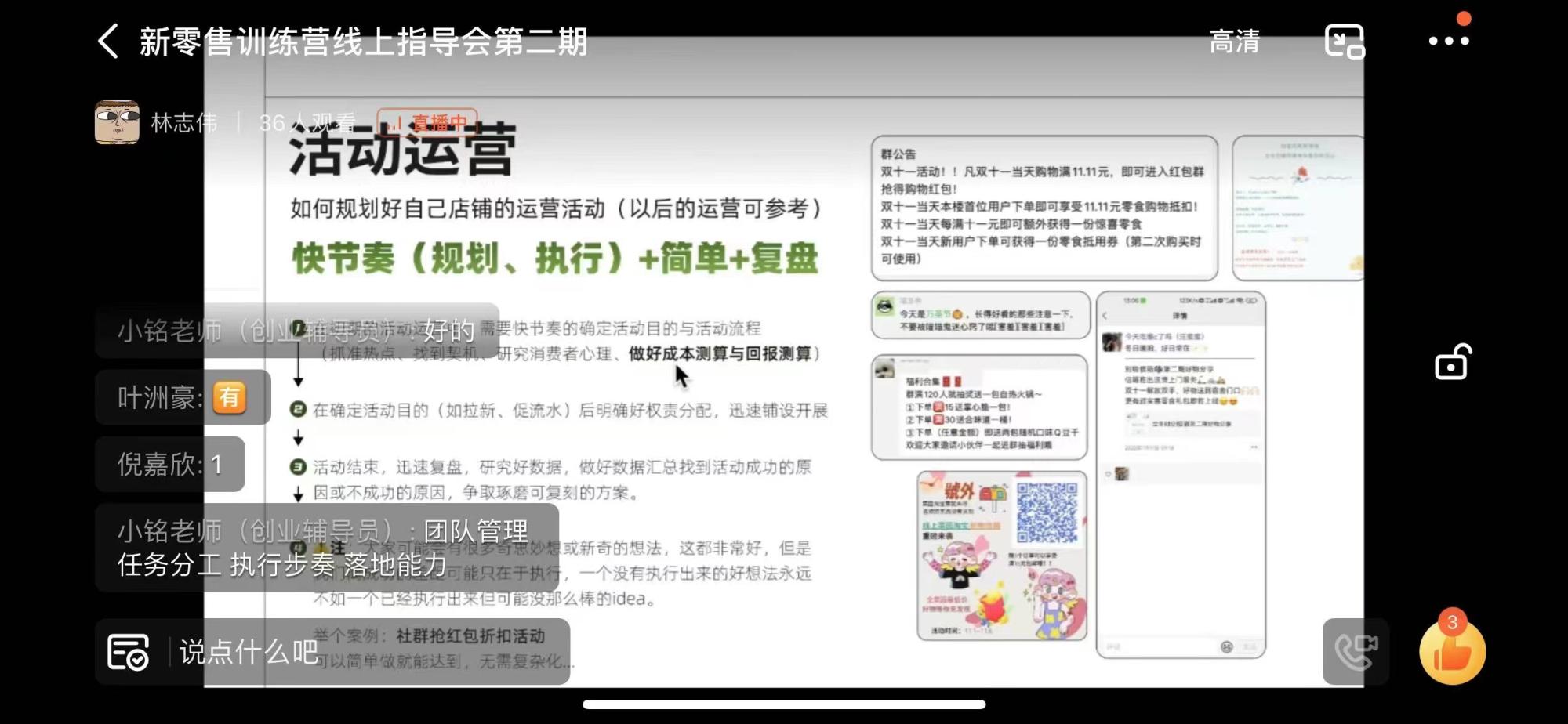 最后,林志伟为参营同学们答疑解惑,提醒同学们运营其实并不难,但需要执行与投入,并对同学们接下来店铺的运营送出了祝福。
