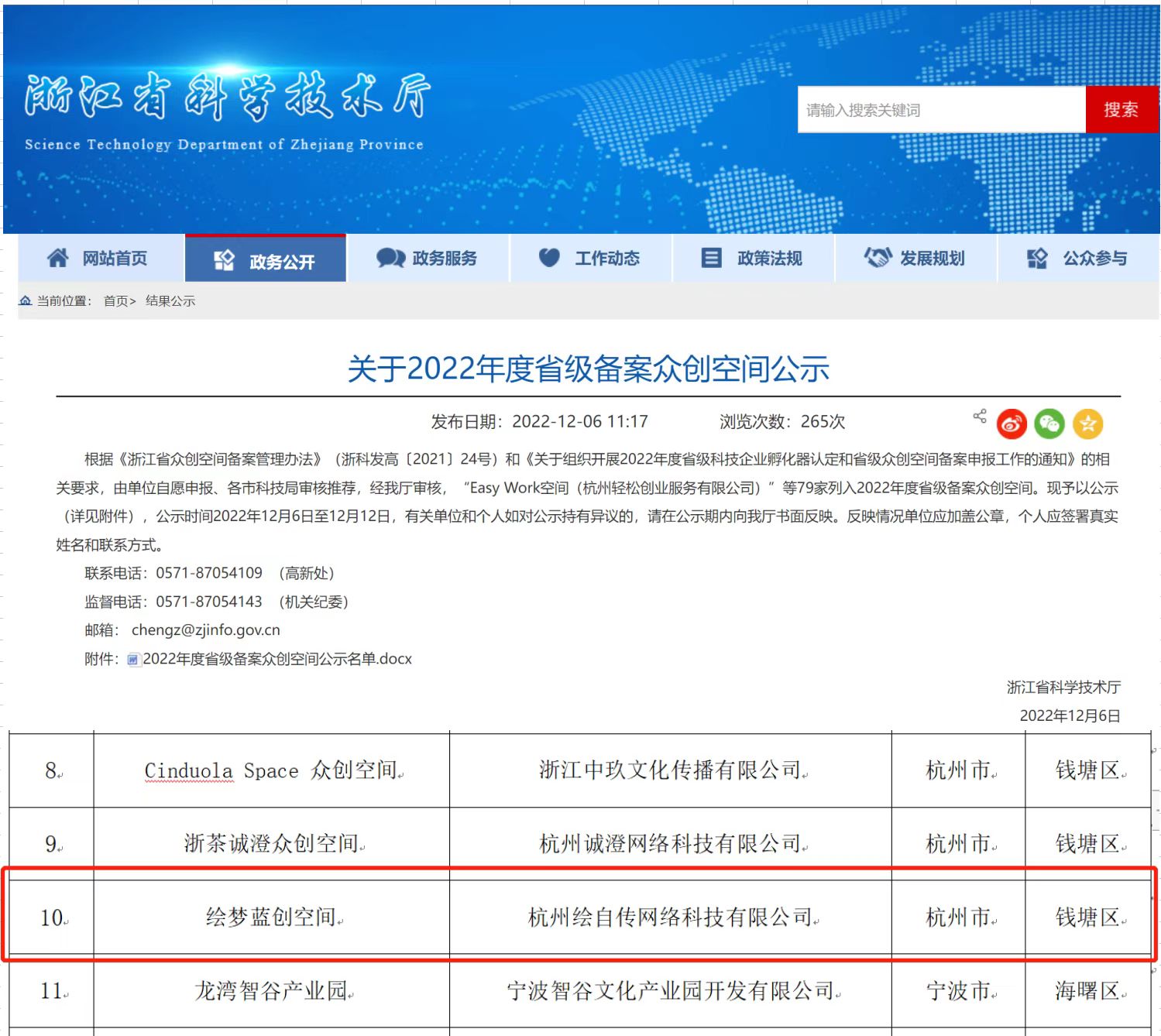 联合杭州绘自传网络科技有限公司共同建设的绘梦蓝创空间入选2022年度浙江省省级众创空间。