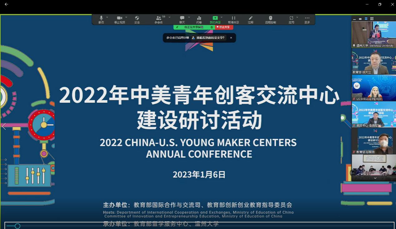 2022年中美青年创客交流中心建设研讨活动于2023年1月上旬举行。活动由教育部国际合作与交流司、教育部创新创业教育指导委员会主办,教育部留学服务中心、温州大学承办,学校以观察员身份参会。