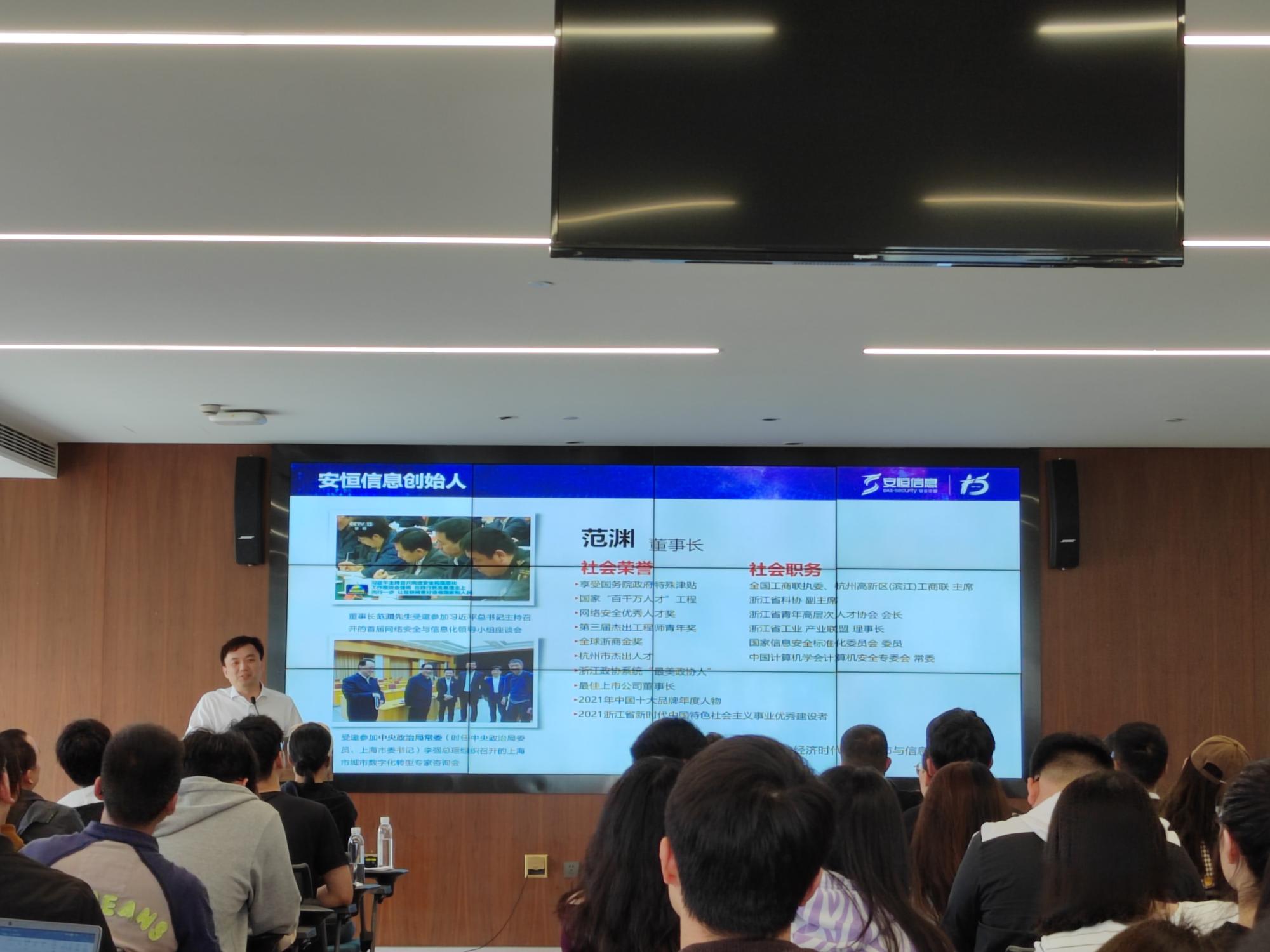随后,安恒信息党委书记、副董事长张小孟在公司会议厅为同学们作了精彩的创业分享。他向同学们介绍了安恒的发展历程,网安行业目前的发展情况、数据价值化面临的困境以及安恒信息是如何对接网安行业的等等方面。指出中国网络安全产业发展正走向国家高度重视、产业快速发展、技术有待突破、人才供不应求的趋势。