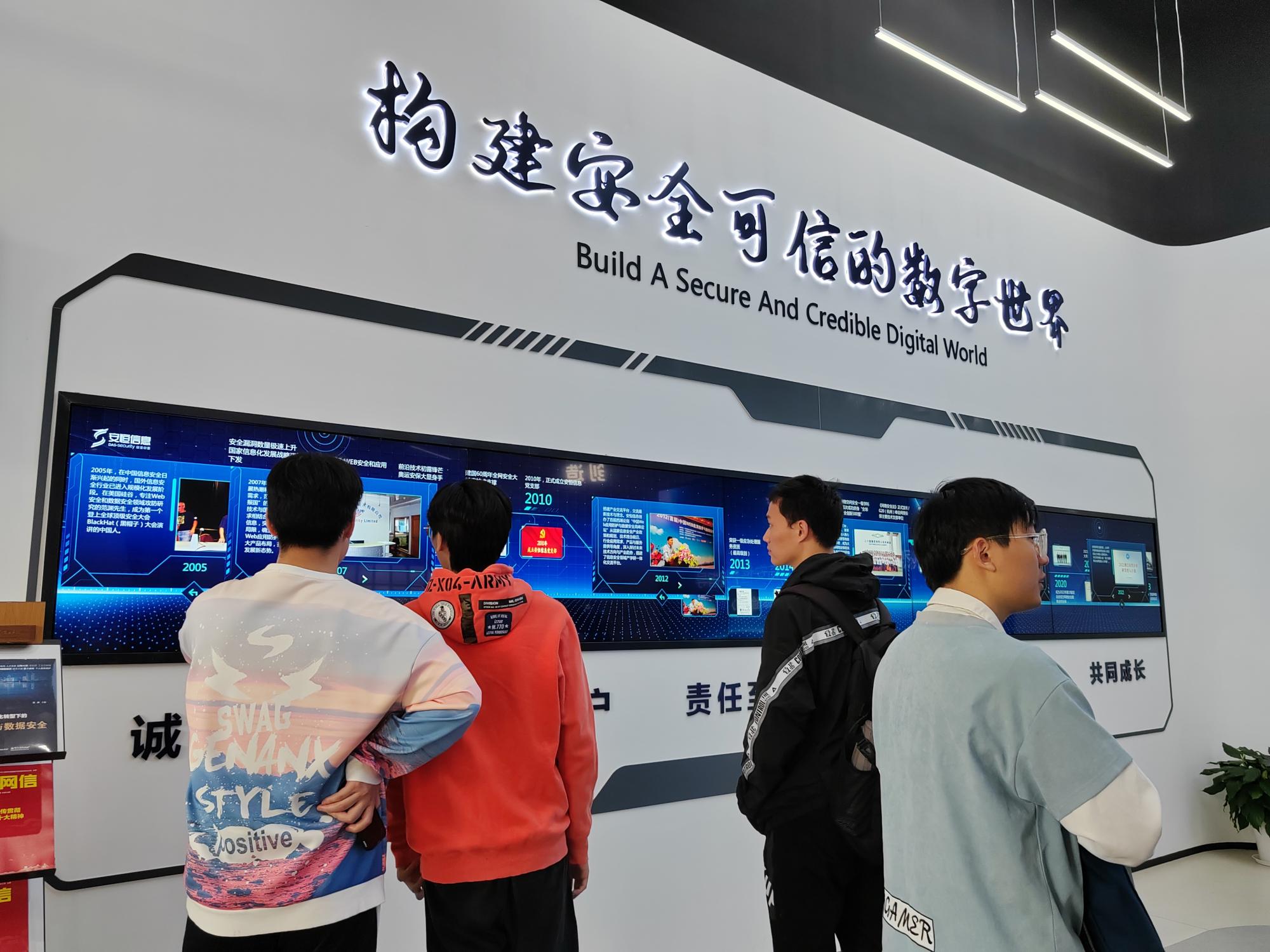 安恒的企业愿景是成为全球领先的数字安全企业,致力于和合作伙伴一起“助力安全中国、助推数字经济、筑牢可信社会”,成为推动时代发展的重要安全力量。同学们参观了安恒一楼的展示大厅,在展厅中细数安恒信息的发展历程、关键核心技术全景图等,不禁对安恒信息的创新和数据安全理念感慨万千。