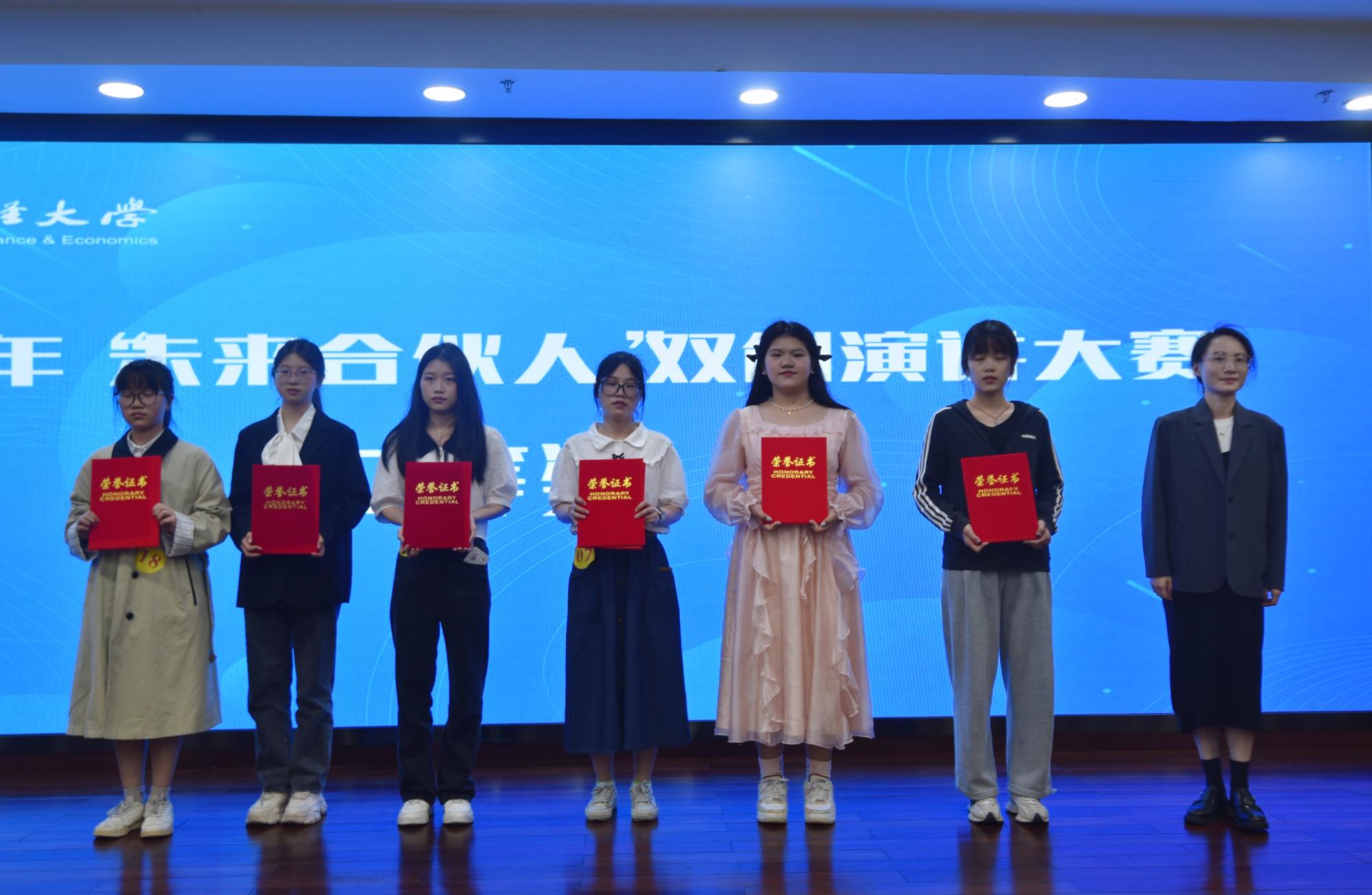 经过激烈角逐,最终法学院何佳乐、信智学院何子洋、财税学院袁嘉慧、经济学院韩梦瑶、数科学院陈可爱、财税学院殷悦获得一等奖,法学院胡思远、法学院张纯一、金融学院丁安轶、数科学院周静怡、会计学院陶也、金融学院王佳颖获得二等奖,人文学院林嘉俐、经济学院张浩浩、法学院王晶、法学院田禹昆、会计学院严涵、财税学院张童轩、经济学院卢克枫、会计学院廖晨汐获得三等奖。