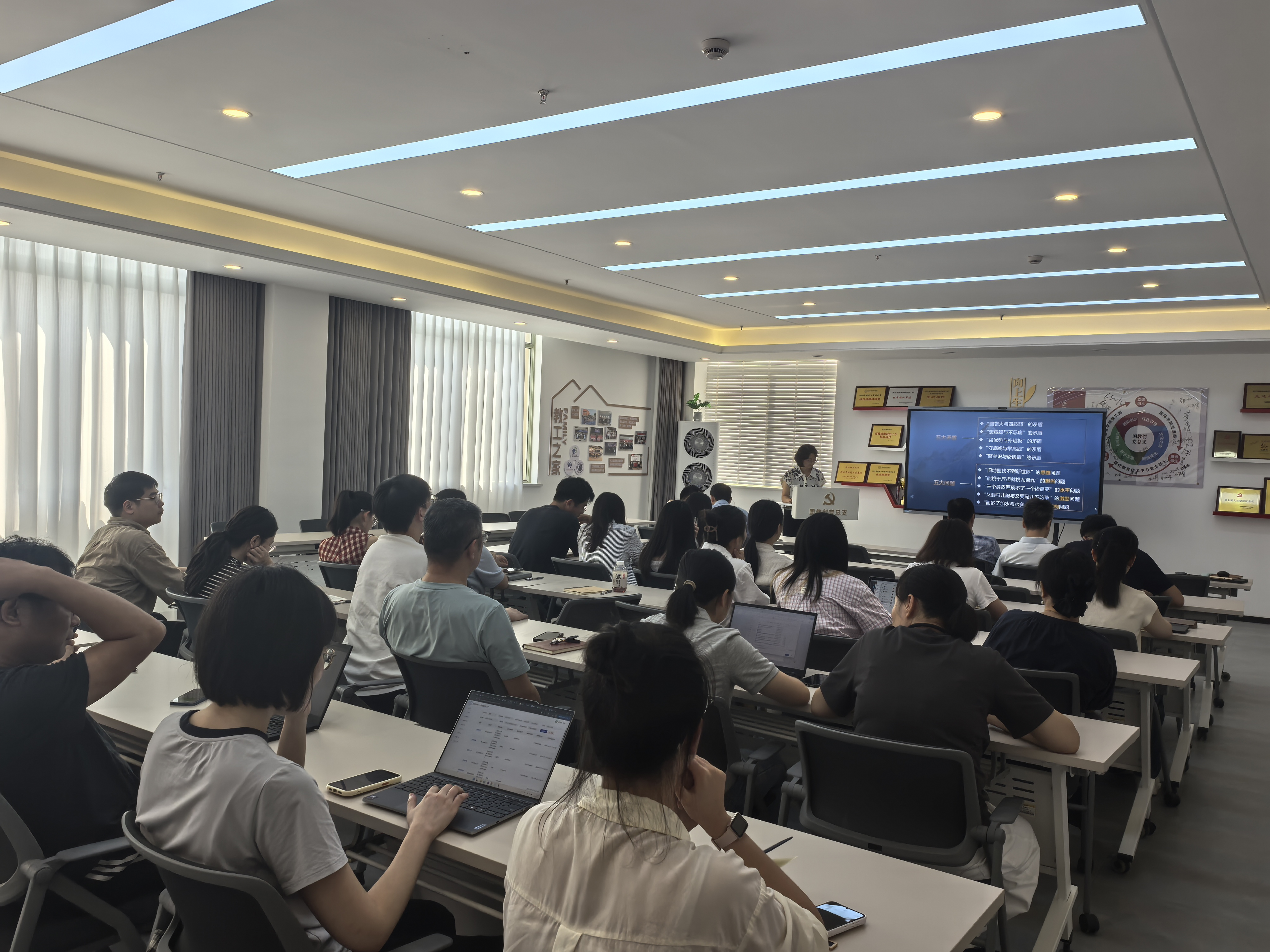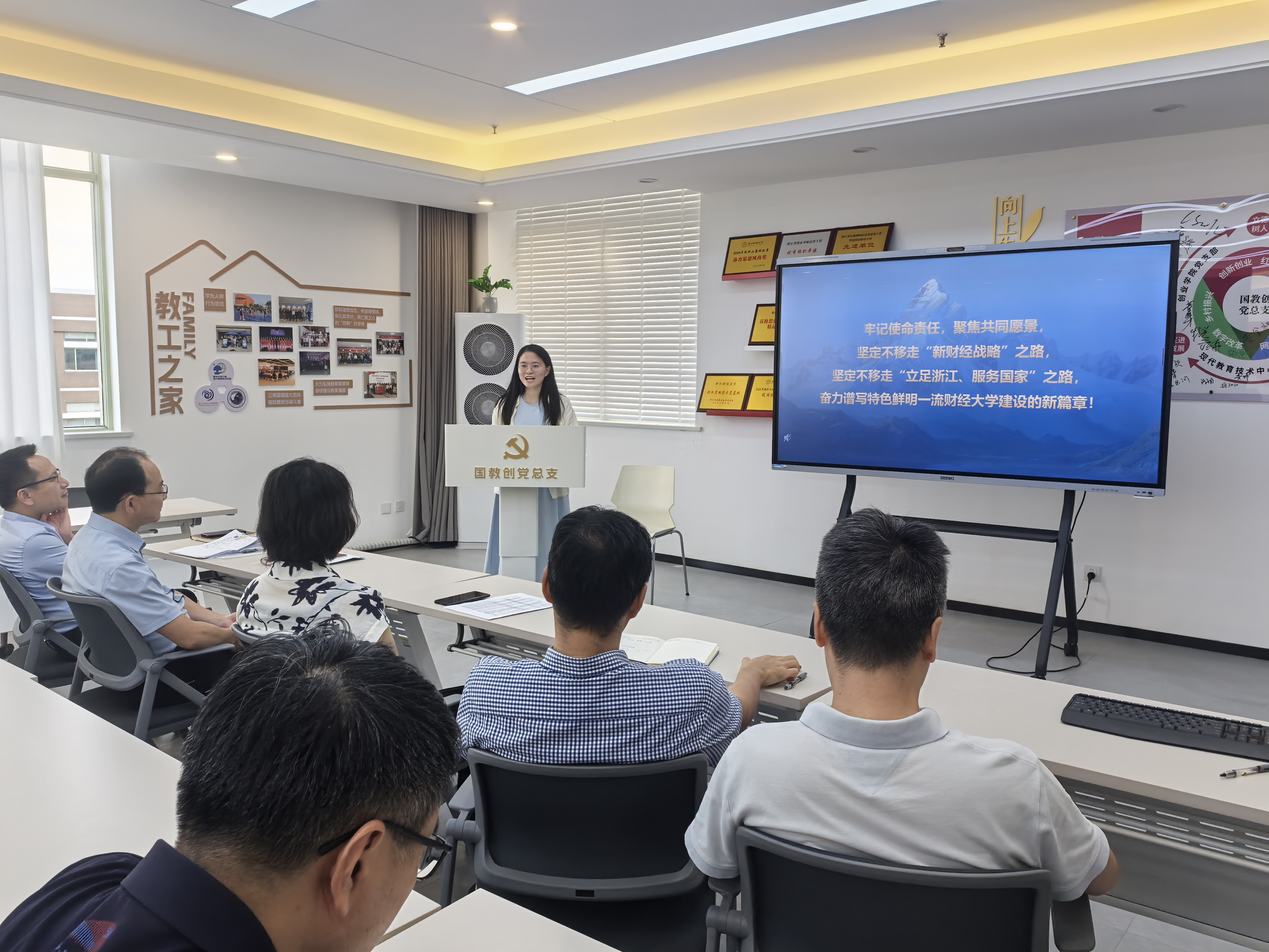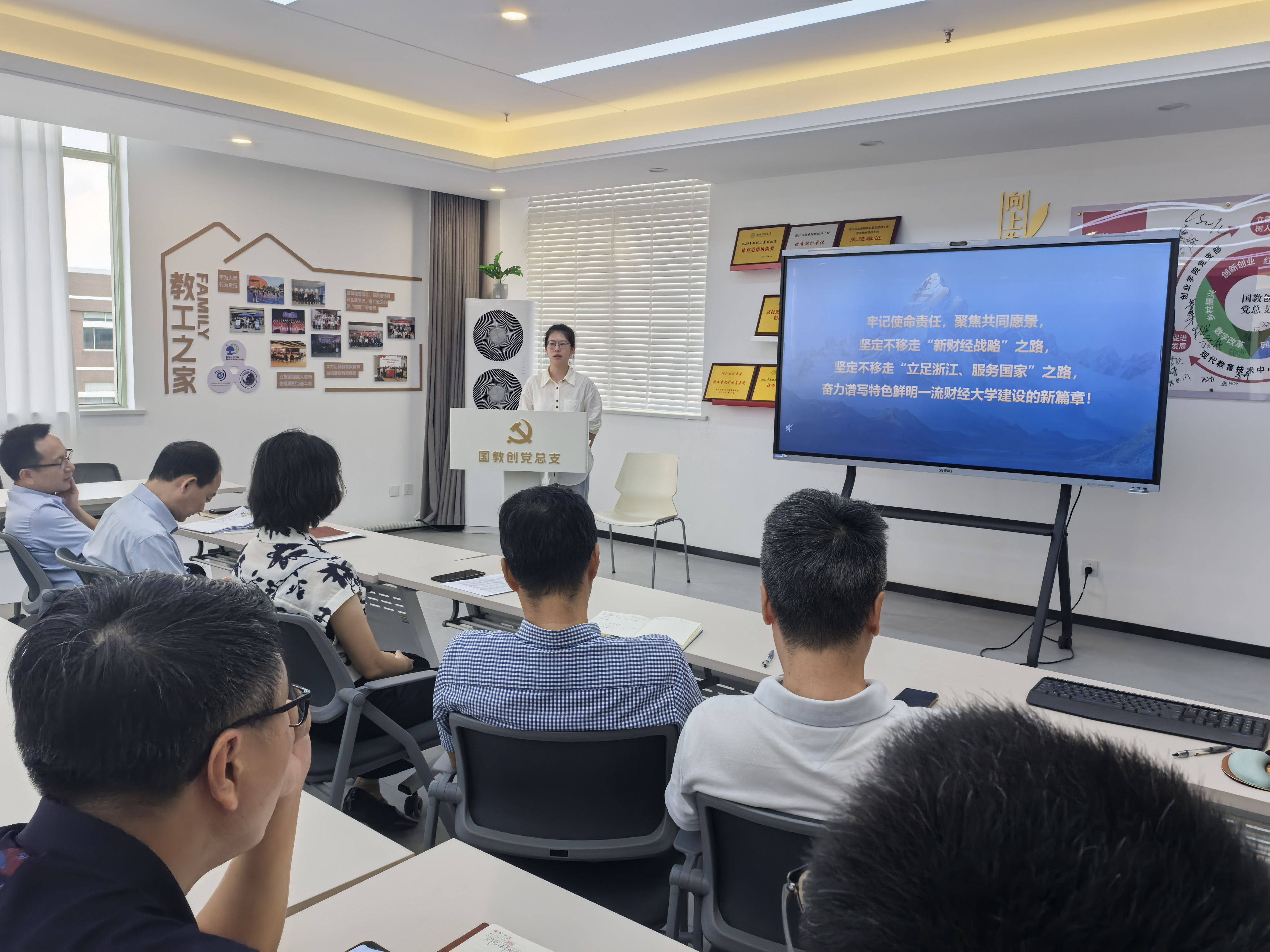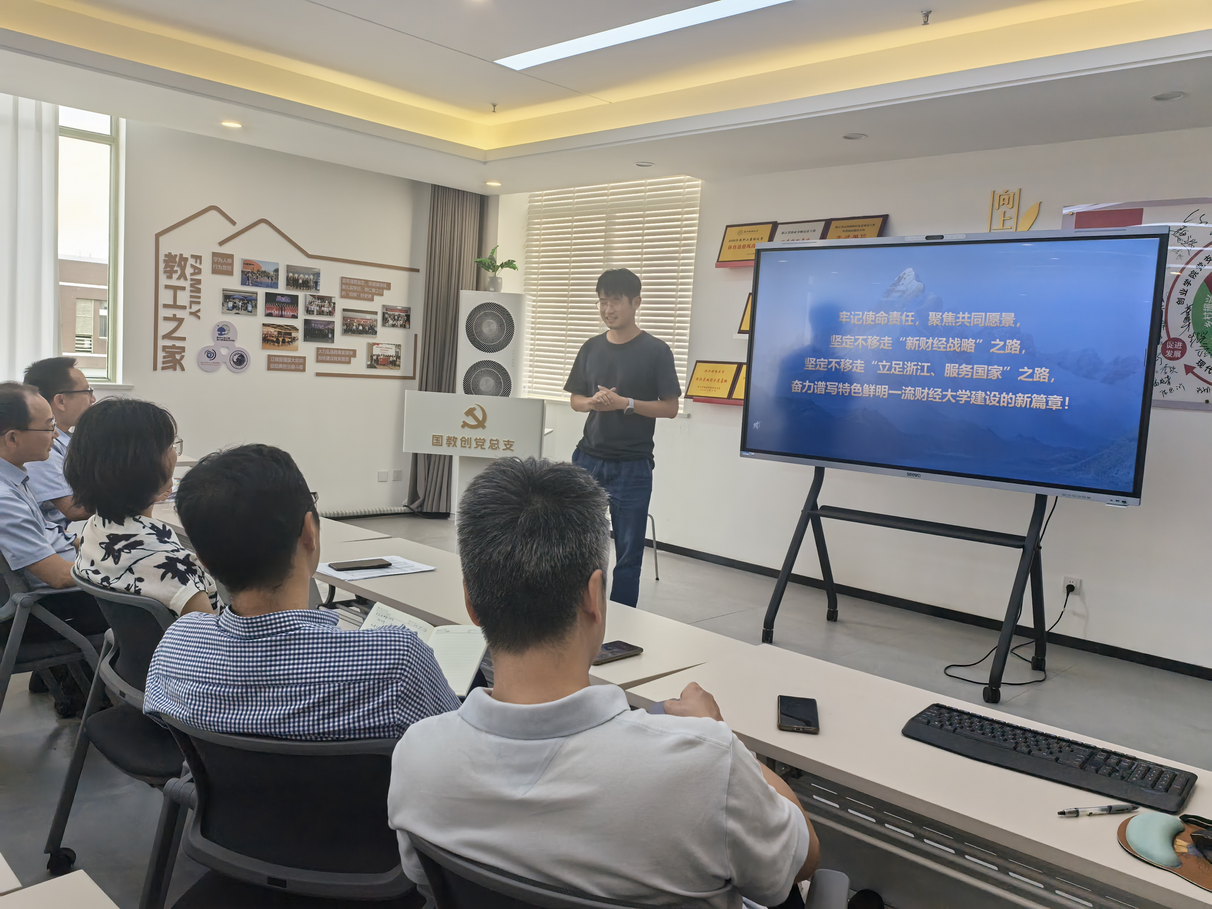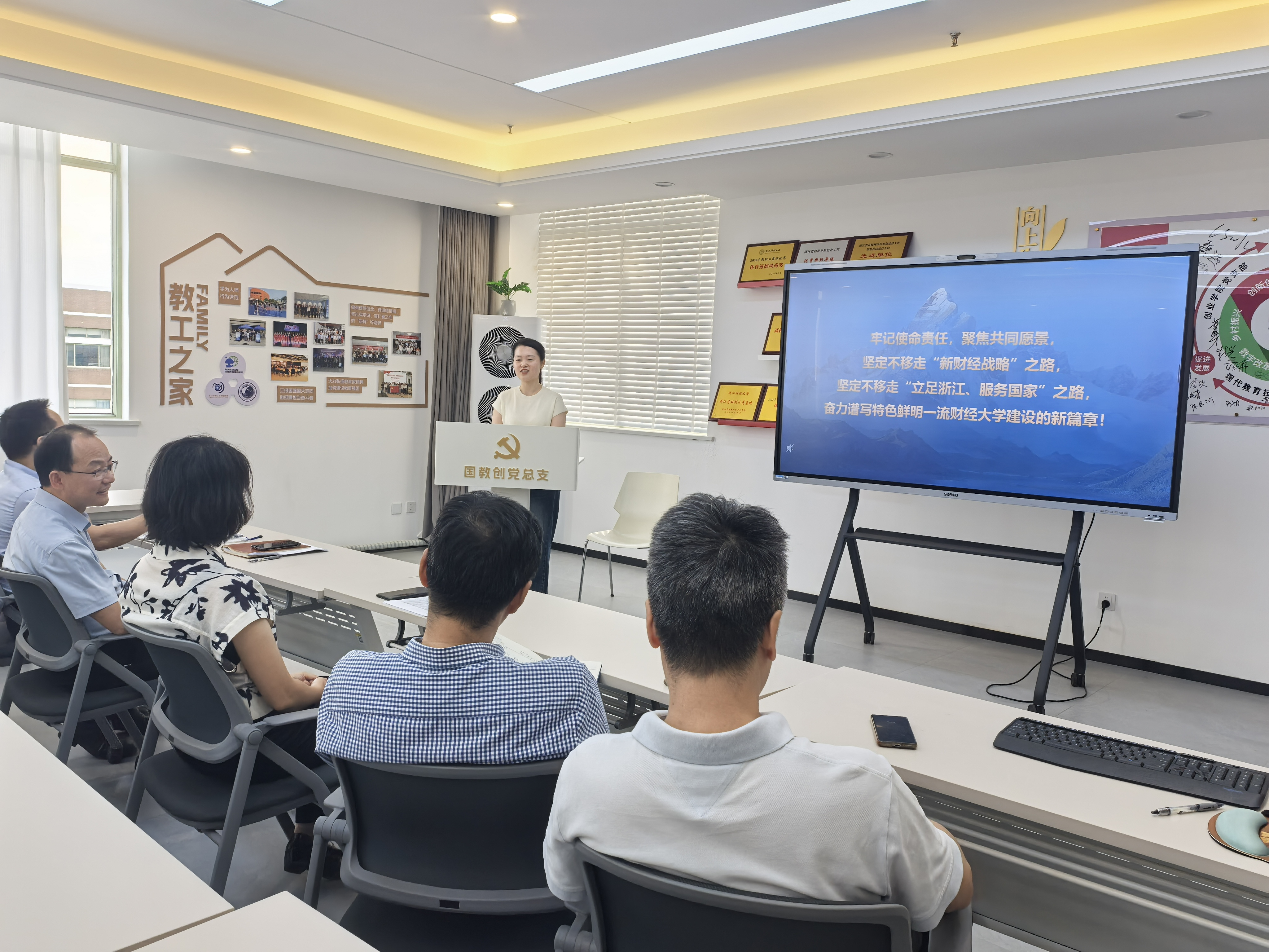 会上,黄金娟书记首先传达了校党委书记、校长魏江在2025年暑期务虚工作会议上的重要讲话精神。她围绕讲话中“新财经战略”实施以来的显著成效展开深入解读,重点介绍了学校在新学科、新培养、新生态、新治理四大体系建设中的突破性进展,让全体教职工切身感受到学校高质量发展的强劲脉搏。结合工作实际,黄金娟强调,面对学校“十四五”收官与“十五五”谋篇的关键节点,党总支需精准聚焦“高水平开放办学”“教科人一体化”等学校核心战略,将“明德笃学、抱朴守真、崇实创新、经世济民”的精神基因深度融入国际教育、创业培养、数字化服务等具体工作,切实破解“融合发展”中的堵点难点。