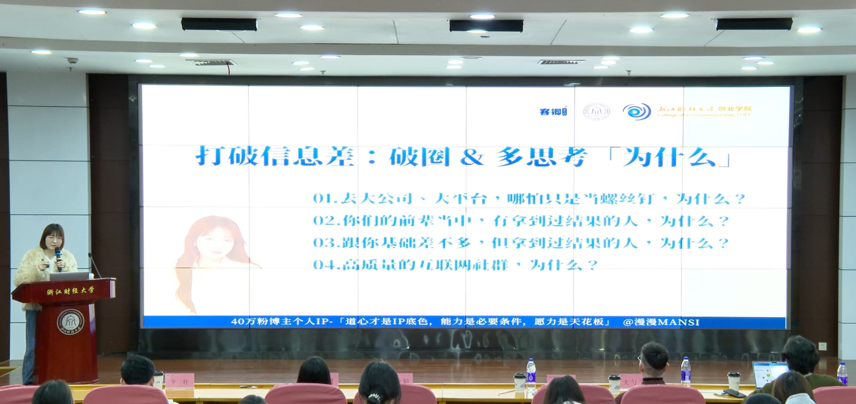 首期课程以“从0到1,玩转内容变现”为主题,特邀两位优秀平台博主担任主讲嘉宾。教育博主漫漫Mansi以“道心是IP底色,能力是必要条件,愿力是天花板”为核心,结合自身成长经历,阐述了内容创作的思维方法与个人价值定位,引导同学们培养互联网思维。数码家居博主大勺子聚焦垂直内容,通过“系列选题”“对标账号拆解”等方法,已打造出多篇爆款笔记。他介绍并系统拆解了接广告、技能变现、带货佣金、开店卖货等四种适合大学生的商业变现路径,为同学们提供了清晰的变现地图。