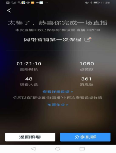 这次上课,学生参与度很高,《创业基础》课,学生1个多小时,回复信息671多条,点赞数430,《网络营销》回复信息361条,点赞数1050,见图2和图3。