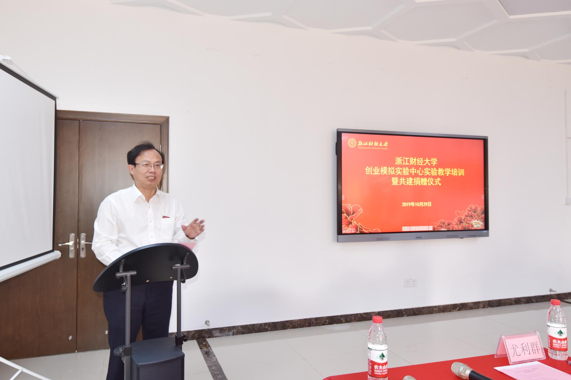院长尤利群主持。仪式开始,尤院长就实验中心的建设情况作了总体介绍,随后,校党委黄建新副书记对捐赠仪式进行致辞,黄书记首先代表学校对前来参加仪式的黄林董事长、朱营总经理一行表示热烈的欢迎,高度评价了两家企业近年来对学校创新创业工作给予的支持。对此次校创业模拟实验中心的正式运营,黄书记指出,这标志着校企合作迈向了一个新的台阶,希望校企进一步深化交流,有效联动,不断助力草莓视频