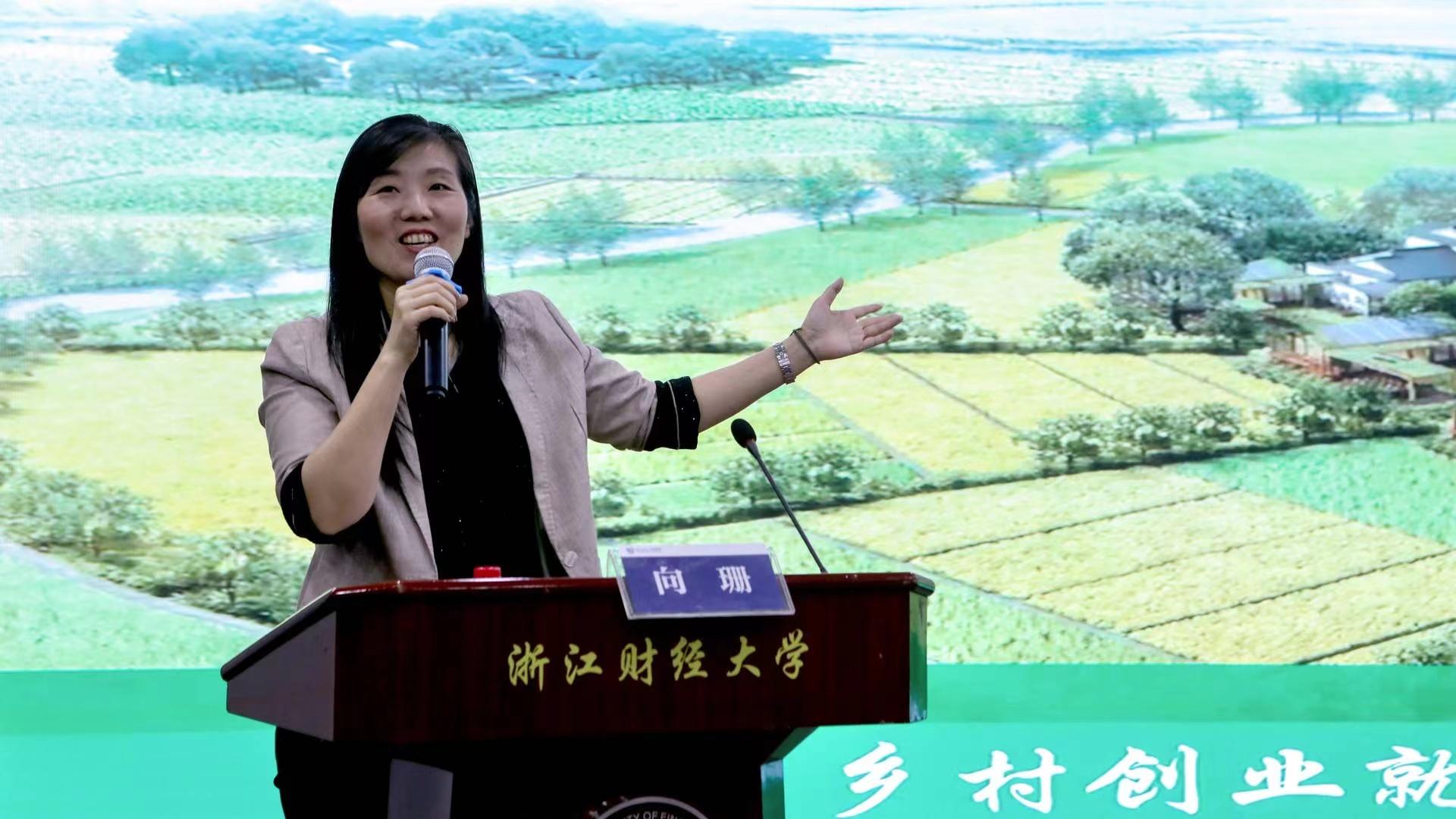向珊女士首先从浙江省未来乡村示范区余杭青山村、崇福农创园嘉兴桐乡等几个乡村振兴的项目实例,向同学们具体展示了什么是乡村创业。随后,向珊老师从社会发展趋势方面分析了助力乡村创业、实现乡村振兴的重要性,其中提到了大城市病日益严重、城市资源承载不堪负荷等城市经济分析和中国社会城镇化趋势及英国与中国的发展问题对比。在此背景下,近年来各行业头部企业逐渐进入乡村,向珊老师从蓝城农业的服务项目出发具体介绍振兴乡村、服务三农的产业和方式,由此引出大学生进入乡村创业就业的机会点,包括现代农业、农旅融合、品牌溢价等形式。向珊老师指出,乡村创业就业需要与职业兴趣和其特定的人才特点需求相结合,通过选择行业、公司与人职匹配的三个实现路径在乡村创业就业方面输入更多的对口大学生人才。