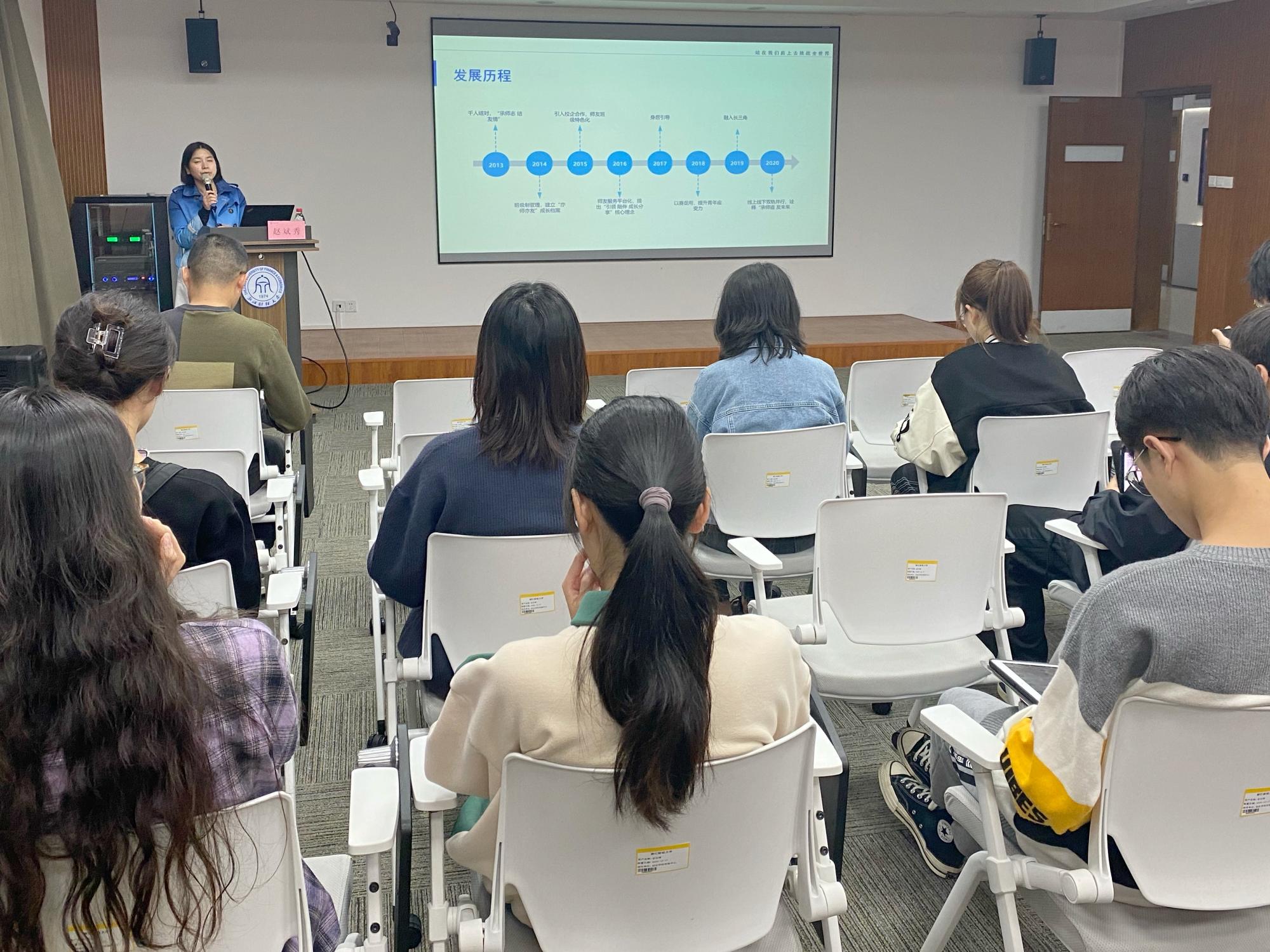 赵斌秀女士首先向同学们介绍了杭州市政府为缓解大学生就业困难而推出的“杭州市大学生就业创业师友计划”,以及这项政策的目标、理念、发展历程和成果。让同学们对于此项能够助推大学生就业创业的政策有了更深刻的了解与认识。