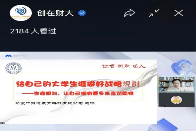 举办、绘梦蓝创空间承办的大学生职业生涯规划讲座在创在财大视频号顺利举行。为了激发新生大学生涯规划意识,学校特邀请北京仁能达教育科技有限公司创始人谢伟开展线上分享会,会议由草莓视频